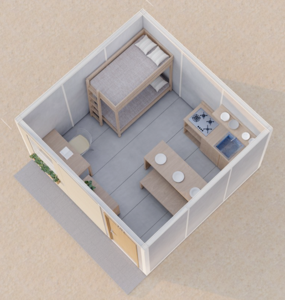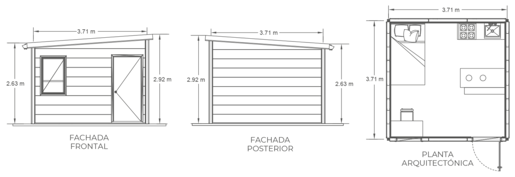 Módulo para vivienda de 14 m2, los sistemas constructivos industrializados de GMI no requieren mano de obra especializada porque, nuestras soluciones son instaladas y ensambladas con el uso de herramientas básicas, además pesan la quinta parte de los tradicionales, lo que permite un rápido montaje gracias a los programas de autoconstrucción asistida y a un curso de formación práctica impartido por nuestra empresa, las comunidades afectadas pueden montar fácil y rápidamente construcciones secas sobre cualquier tipo de terreno.MÓDULO